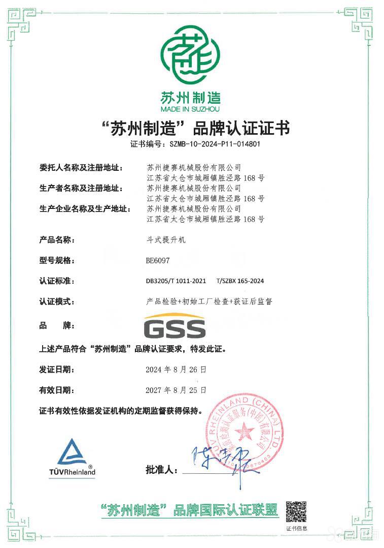 2024年11月,在苏州市市场监管局举办的全市检验检测认证服务行业沙龙活动上,现场颁发了一批“苏州制造”品牌认证证书,苏州捷赛机械股份有限公司申报的产品“斗式提升机”位列其中。目前,捷赛机械已有专利近百项,其中发明专利9项,参与9项国家标准制修订,其中2项已发布实施。