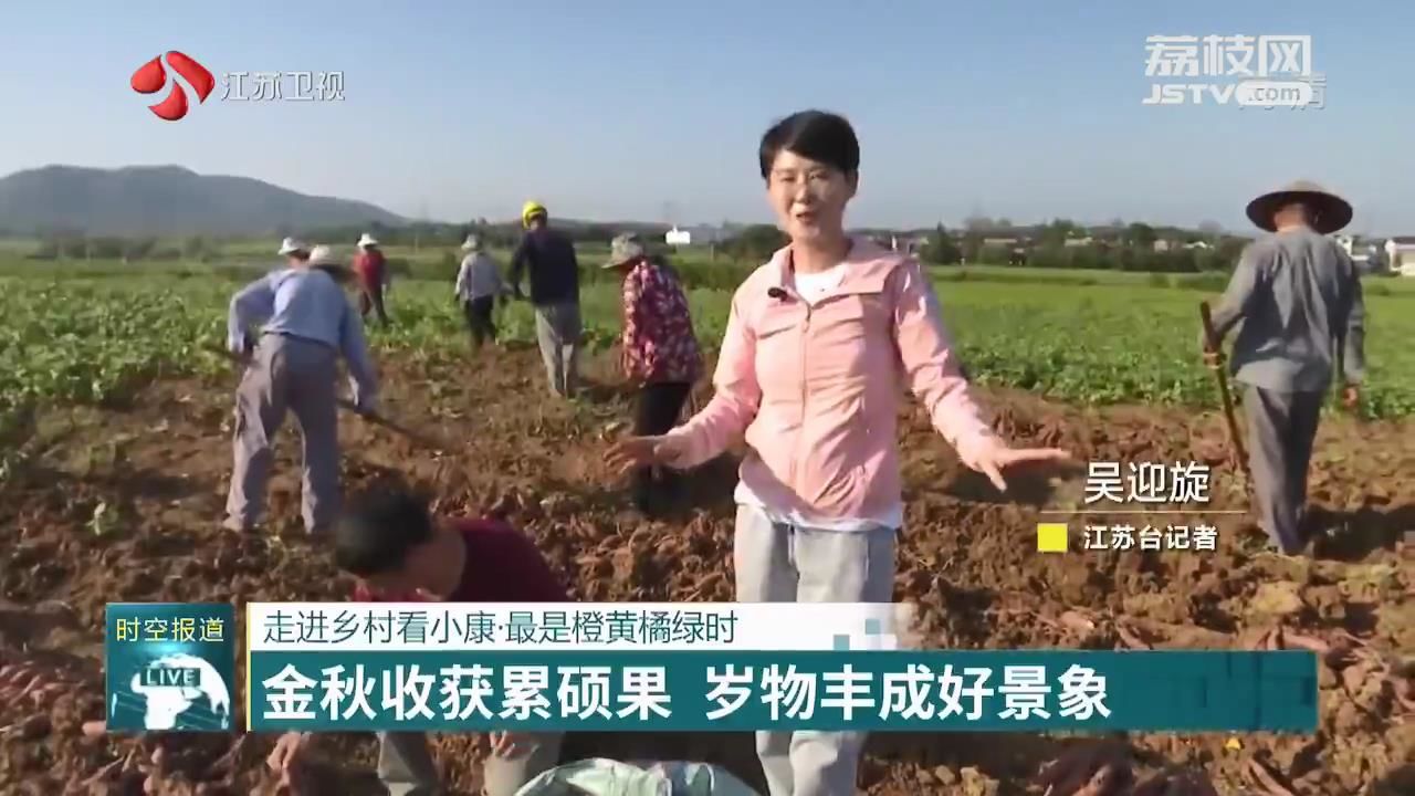 江苏台记者吴迎旋说:“我现在所在的位置是村上正在丰收的红薯田,我身后的大哥大姐们正在忙活着。”