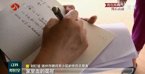 54岁的刘红斌是扬州市栖月苑小区的党员志愿者,这些天,他和同为志愿者的妻子一起,给小区居民买菜、送药。为了防止出错,他把居民需求全都写在了笔记本上。20多天下来,本子早已记录得密密麻麻。