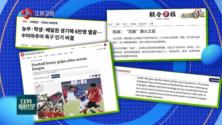 “苏超”的热度,还蔓延到了海外媒体平台。英国《独立报》全文转载中国日报社报道《足球热浪席卷江苏》,英国《经济学人》认为“苏超”对于经济的带动结果“看起来相当不错”,新加坡《联合早报》三次发文报道“苏超”最新动态,韩国《中央日报》关注“苏超”球员的背景和故事。“苏超”以足球为媒,让世界看见了一个昂扬自信的江苏——这里,物质富足与精神富有兼备,历史底蕴与时代活力交融,正不断开创高质量发展新局面。