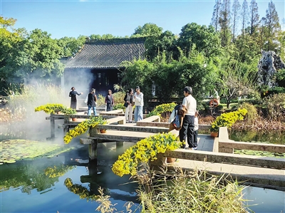 菊展使用了约60个品种、共计万盆菊花,在场景营造与艺术表达上实现更多突破,营造出“一步一景、移步换景”的沉浸式观赏体验。步入南园,曲径通幽的小路两旁,菊花沿径铺设,形成蜿蜒的“菊花小径”;九曲桥与拱桥外侧,枝条纤长的菊花如金色瀑布般垂落,与桥下流水相映成趣。令人称道的是,布展者巧妙利用岩石缝隙、乔木树底等角落点缀菊花,使它们仿佛天然生长于此,展现出“虽由人作,宛自天开”的美学意境。