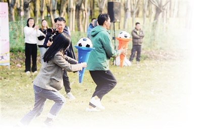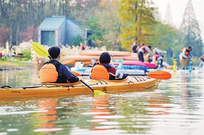下午的职工亲子趣味运动会围绕“运动+科普+生态”主线,设计肚子运“西瓜”、斯巴达越野、迷宫探秘等环节,60组家庭在欢笑中完成挑战。随后,亲子家庭走进长江生态科普基地,深入了解长江生态保护知识。与此同时,“有你太好”青年交友活动在森林草坪与水域间展开,40名青年通过真人CS、皮划艇竞技等互动项目,在运动中拓展社交圈层。参与青年交友的宁先生表示:“在这么美的自然环境里运动、交流,轻松又自在,还认识了不少志同道合的朋友。”