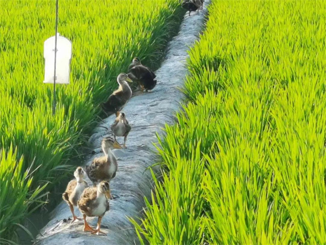 不远处李臣农场的稻田内,成群结队的鸭子扑闪着翅膀,抢食着散落在田间的谷粒,一钻进稻田就不见了踪影。长期在稻田放养的鸭子,肉质紧实,营养丰富,同时鸭稻田里产出的大米富含钙、铁、锌等微量元素,颗粒饱满,晶莹剔透。“稻鸭共生”,一地双收的新“稻”路作为农牧结合的一种新模式,既能生产好米,又能生产好鸭,不仅为大家打开了一扇增收致富的新大门,更使前黄大米“生态、安全、绿色、有机”农畜产品招牌愈加响亮。