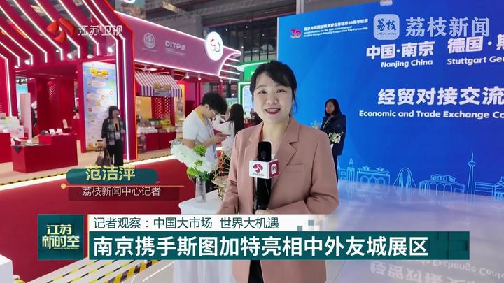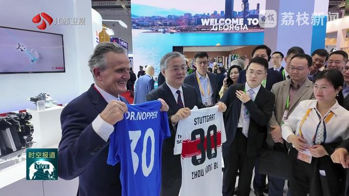 自1995年正式建立友好城市关系以来,南京与斯图加特的合作领域持续拓宽。截至2025年10月,德国在南京累计设立投资项目309个,实际使用德资22亿美元;南京在德国投资协议额达7.3亿美元。2024年,南京与德国进出口贸易总额为43.5亿美元。本次展览展出了双方在科技创新、人文交流领域的丰硕成果。其中既有国内首条“机器人生产机器人”的智能化产线,也有秦淮灯会和圣诞集市的特色文创产品,生动串联起两地商文旅体融合高质量发展的“共同”故事。开馆仪式上,南京和斯图加特双方互赠了象征30年友谊的30号球衣。