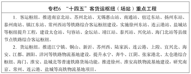 运输服务。客货运全程服务效率更高,助力城市群一体发展的条件不断改善。省会南京与国家主要城市群4-6小时通达,与长三角中心城市1小时通达,与各设区市1.5小时通达;基本实现各设区市间2小时通达,与长三角中心区城市3小时通达;宁镇扬、苏锡常、沪苏通、徐连淮形成1小时交通圈。铁路货运体系基本形成,高铁物流起步发展,中欧班列持续发力,年开行量超过2200列,铁路集装箱多式联运量年均增长10%以上。