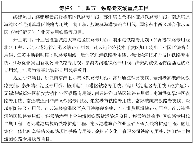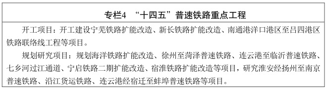 “三横”通道。陆桥通道是国家普速铁路区际快捷大能力通道的组成部分,依托陇海铁路,对外连接中原、西北等地区,紧密衔接新疆霍尔果斯、阿拉山口等进入中亚和欧洲的重要口岸,是丝绸之路经济带跨境物流大走廊、“一带一路”国际大通道。三洋通道是国家普速铁路区际快捷大能力通道的组成部分,依托宿淮铁路、新长铁路淮安至盐城段、海洋铁路等,规划建设南通港洋口港区至吕四港区铁路联络线,对外连接中原等地区,是支撑长江经济带通州湾集装箱新出海口建设的重要海铁联运通道。沿江通道是国家普速铁路区际快捷大能力通道的组成部分,由宁启铁路、合宁铁路、宁芜铁路等构成,对外连接长江中游和成渝等地区,是长江经济带综合立体交通走廊的重要组成部分。