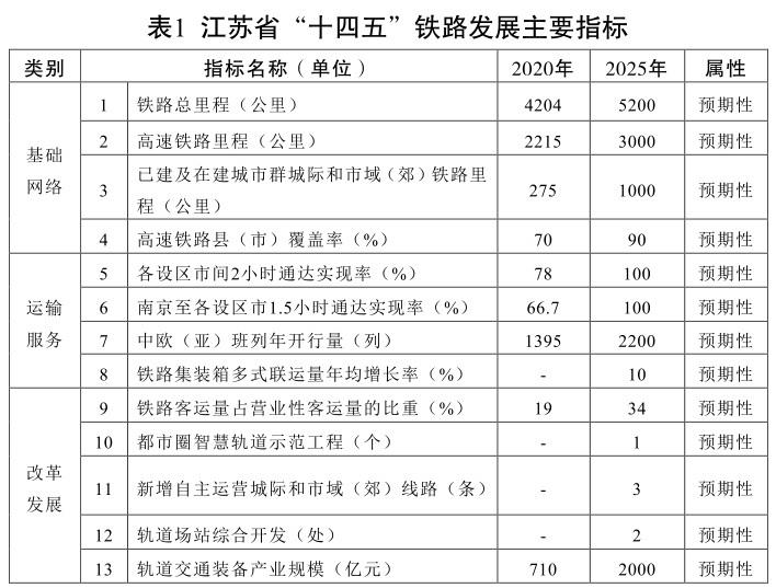 日前,江苏省政府办公厅印发江苏省“十四五”铁路发展暨中长期路网布局规划,明确到2025年,江苏新增铁路里程约1000公里,总里程达到5200公里。高速铁路里程约3000公里,覆盖所有设区市和90%左右县(市)。省会南京与国家主要城市群4-6小时通达,与长三角中心城市1小时通达,与各设区市1.5小时通达。