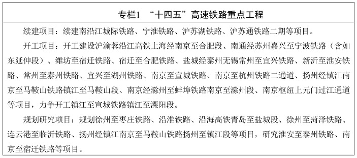 “六横”通道。陆桥通道为国家高铁主通道,经连云港、徐州等城市,依托连徐铁路、郑徐高铁等,对外连接中原城市群、关中平原城市群等。沿江通道为国家高铁主通道,经沿江八市,依托宁安城际铁路,加快贯通南沿江城际铁路,规划建设沪渝蓉沿江高铁上海经南京至合肥段,对外连接长江中游城市群和成渝等地区。沪宁通道为国家高铁主通道,经苏州、无锡、常州、镇江、南京等城市,依托京沪高铁南京至上海段、沪宁城际铁路等,形成长三角城市群中心区城际主通道。沿淮通道经盐城、淮安等城市,规划研究沿淮铁路,对外连接中原城市群、关中平原城市群等。徐盐通道(上海至太原通道)经盐城、淮安、宿迁、徐州等城市,依托徐宿淮盐铁路,规划研究徐州至菏泽铁路、徐州至枣庄铁路等,对外连接鲁西南地区、晋中城市群等。沪苏浙皖通道经苏州、无锡、常州、南京等城市,依托宁杭铁路,加快贯通沪苏湖铁路,形成长三角城市群内部太湖南岸地区的快速城际通道。