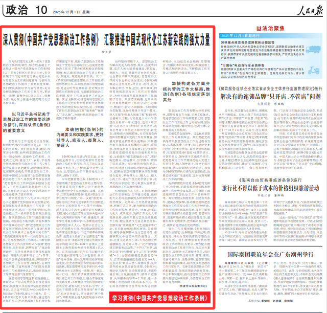 作为我们党历史上第一部关于思想政治工作的统领性、综合性基础主干法规,《中国共产党思想政治工作条例》(以下简称《条例》)的制定出台,充分体现了以习近平同志为核心的党中央对思想政治工作的高度重视,为新时代思想政治工作提供了重要制度保障。我们要认真抓好学习宣传贯彻,充分发挥思想政治工作的引领作用,更好统一思想、凝聚共识,坚定信心、鼓舞斗志,凝心聚力推进中国式现代化江苏新实践。