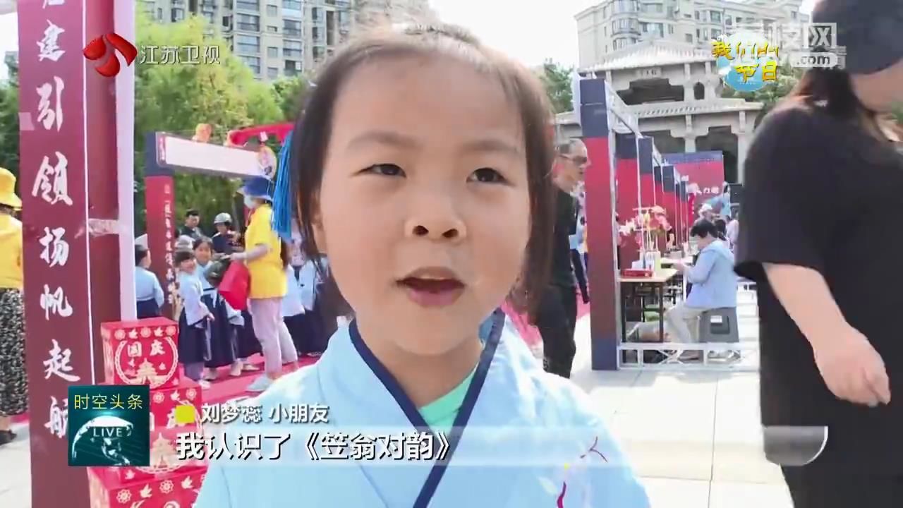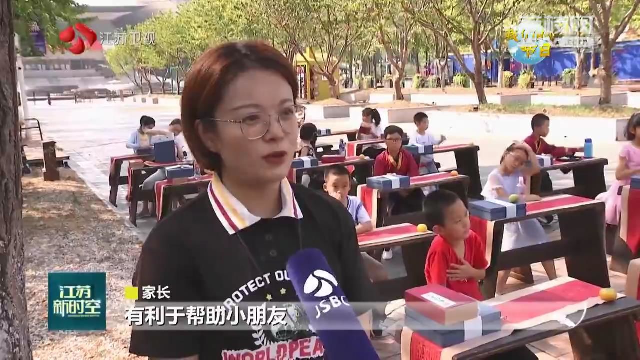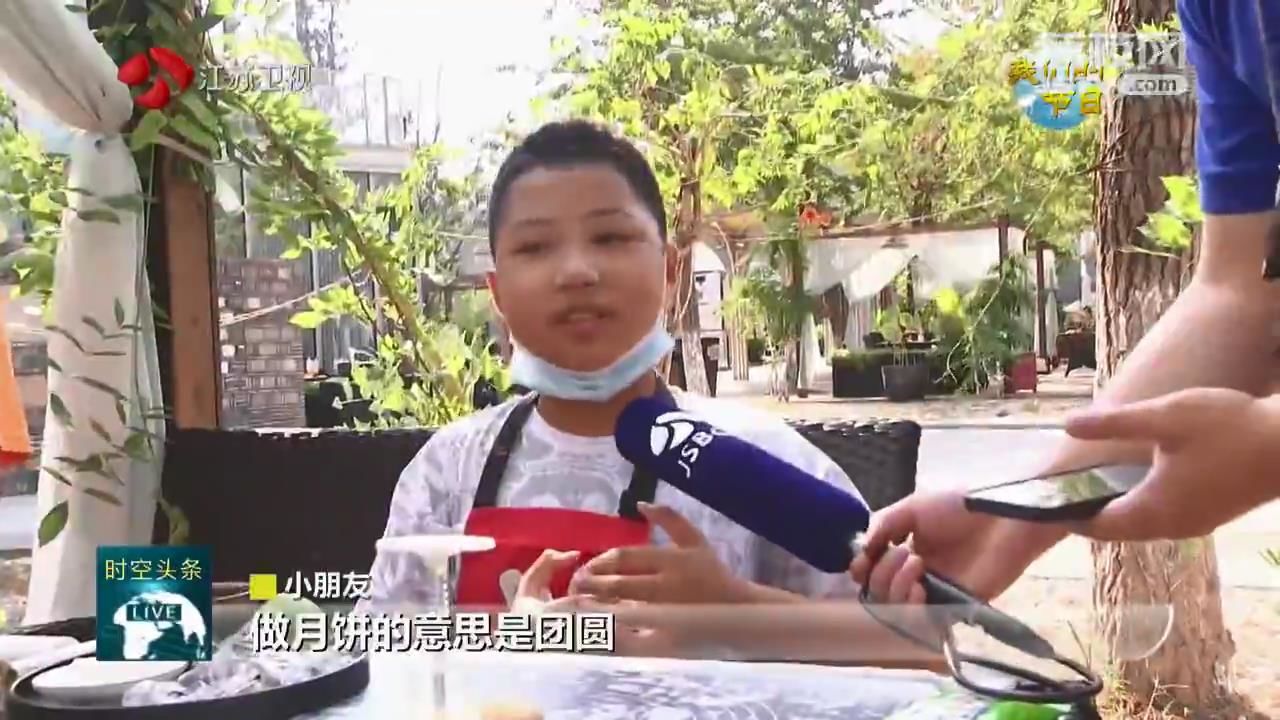 江苏台记者黄蒙说:“这里是南京银杏里文化艺术街区。我身旁的孩子们今天来到这里穿汉服、品茗茶、猜谜语、做月饼,在游戏中体验中秋民俗的文化魅力。”