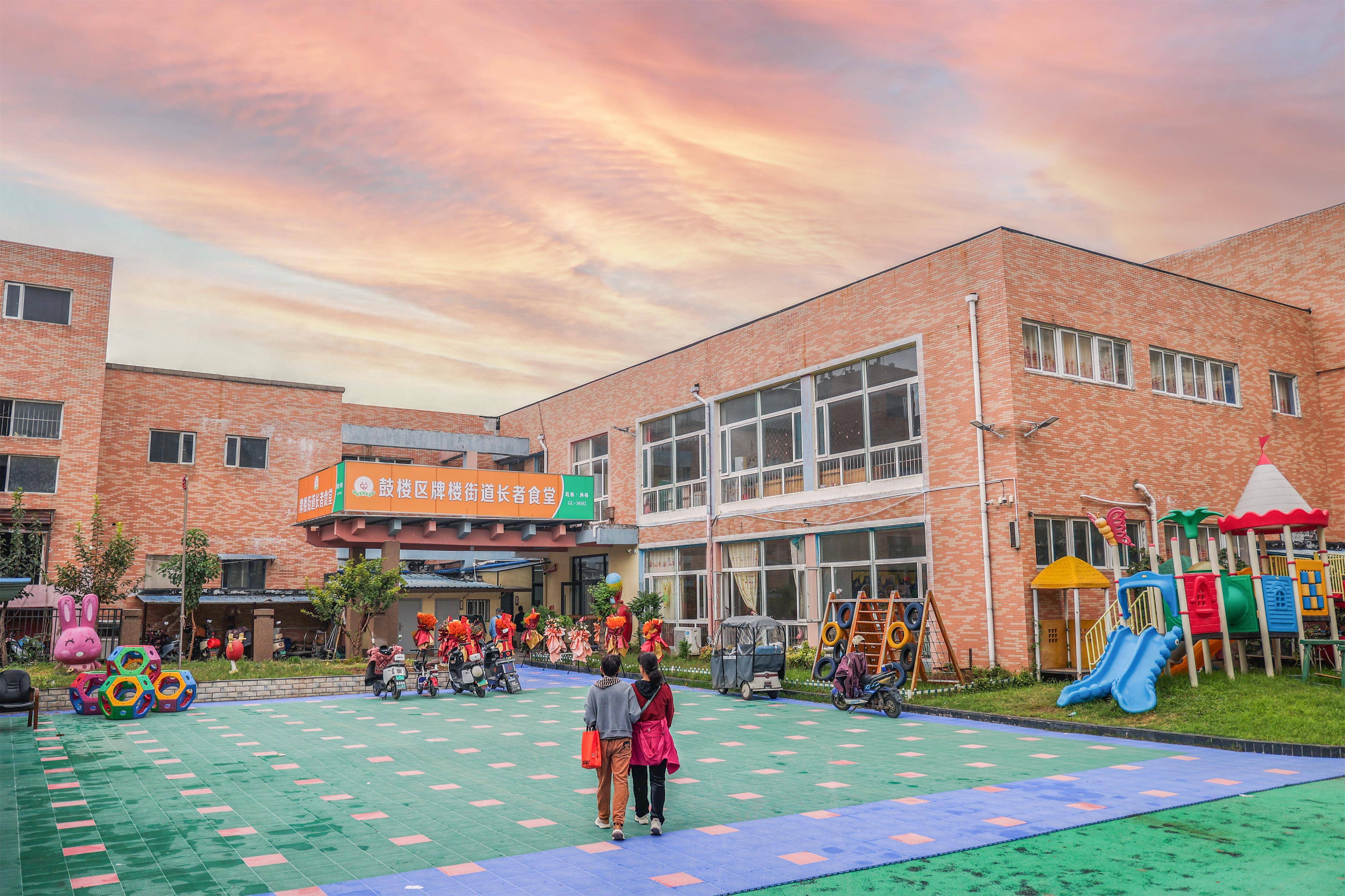 从鼓楼区奔腾大道水云间一期南门进入,步行不到百米,一座色彩明快的建筑矗立眼前。滑梯和攀爬架静静地立在院中,周围仿佛还回荡着幼儿园孩子们的嬉笑声,但醒目的“鼓楼区牌楼街道长者食堂”招牌,已悄然述说着空间的嬗变。