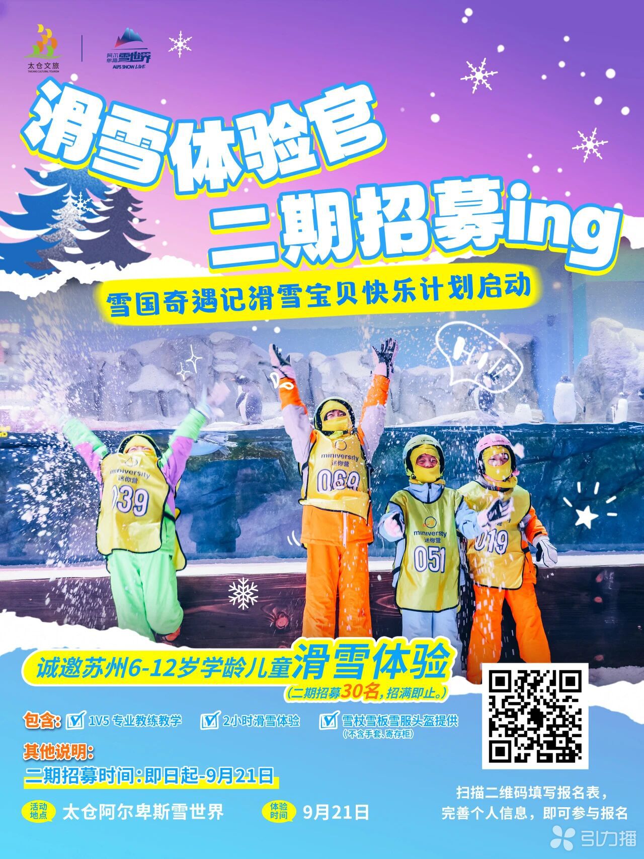 此次招募对象为6至12岁学龄儿童,需提供苏州大市身份证明。9月21日前,扫描海报二维码填写信息报名,就能实现滑雪自由。