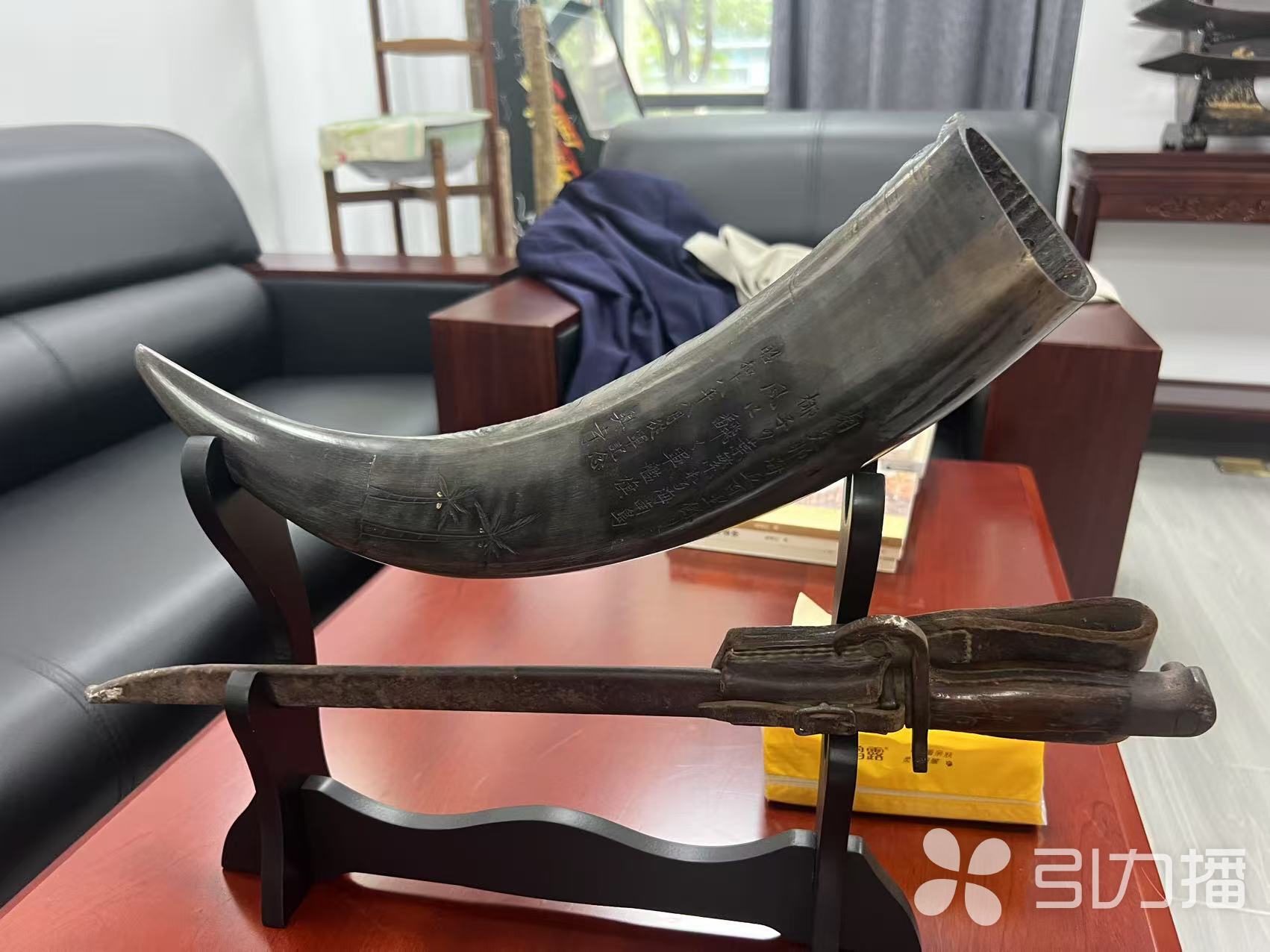 “这是30式刺刀,也就是俗称‘三八大盖’的38式步枪上的刺刀。”张林说,他对二战史及这把刺刀作了认真研究。小仓兵工厂初名关口制作所,1861年2月兴建。1870年起称为东京炮兵工厂,又称小石川炮兵工厂,1923年起改称东京陆军兵工厂。“日本侵华战争期间,小仓兵工厂生产的步枪及刺刀大量用于中国战场。这种带皮挂和刀鞘的刺刀方便士兵携带,刀上沾满了抗日军民的鲜血,是日军侵华的罪证。”而那方匾额,则是张林从日本一处旧货市场上觅得。“我看上面写着卢沟桥事变和‘八·一三’淞沪会战后,这户人家遭遇日本飞机连续轰炸,损毁房屋共计十阁,到两年后才募资重建。”张林轻抚匾额边缘的焦黑痕迹,他说这不是冷冰冰的物件,而是带着体温的铁证。