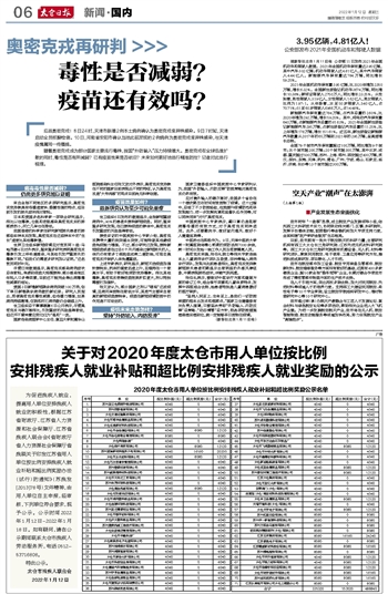 关于对2020年度太仓市用人单位按比例 安排残疾人就业补贴和超比例安排残疾人就业奖励的公示