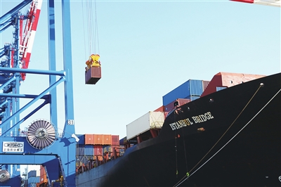 10月19日,在波兰北部格但斯克港,从中国宁波舟山港出发的中欧北极快航航线首艘货船进行装卸工作。