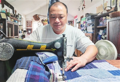 陆燕明的旧物改造之路始于他坚持的节俭、环保理念。陆燕明家三楼,感觉就是一个旧物改造工作室,在这里,他利用缝纫机将老粗布制作成围裙、布鞋,将旧帆布包与老粗布结合,制作出独一无二的环保包,在一针一线的缝合中,旧物“潮”起来了。原本将被丢弃的“废品”,在老粗布的加持下,蜕变为实用与美观兼备的“艺术品”。